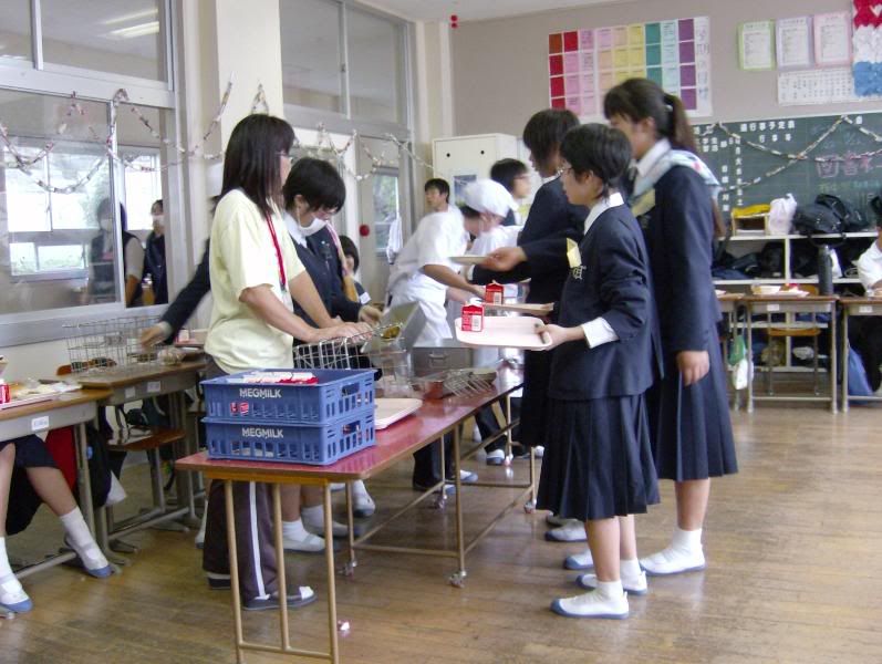 Toen was het alweer lunchtijd, en hebben we lekker gelunched met een soort van bapao waar we zelf vlees en groente in moesten doen, en een soort van noodlesoep met doorzichtige noodles, en nog een broodje met jam, heeel lekker allemaal. Het was ook enorm gezellig om zeg maar met iedereen uit de klas te eten (lijkt me ook heel gezellig om gewoon iedere dag te doen ipv je eigen verlepte boterhammen elke dag te moeten meenemen :P). Het is echt heel cool om te zien dat er echt een heel sterk groepsverband is in Japan. Natuurlijk hebben wij als buitenlanders ook niet echt iets te zien gekregen van "ijime", zeg maar pesten, maar aan niets was te merken dat dat er voorkwam e.d.