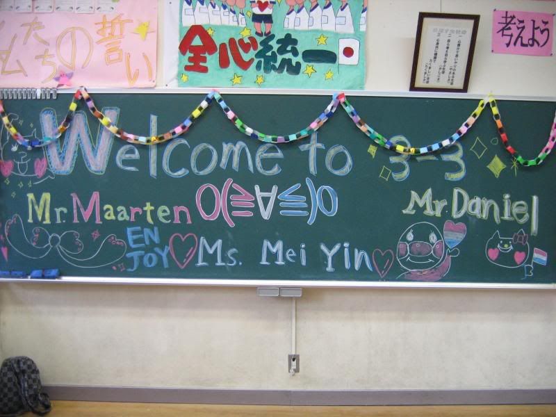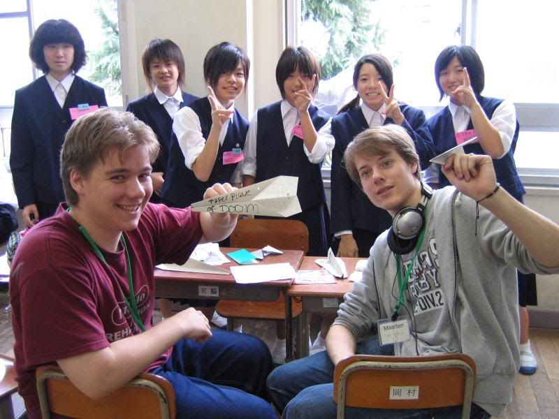 Na deze vrij officiele ceremonie werden we door de leerlingen (vooral de meisjes) meegesleurd naar een klaslokaal in groepjes van drie, waar we verschillende activiteiten gingen doen. Maarten, Mei-Yin en ik hebben origami, kalligrafie, vliegtuigjes vouwen, traditionele Japanse slippers maken, en vliegtuigjes vouwen gedaan. We werden ook nog overdonderd met "nyappi", zeg maar een soort groet die de jongere mensen (vooral de meisjes) nogal eens gebruiken. Natuurlijk moesten we het even nadoen, wat meteen met veel enthousiast gegil werd beantwoord. Ook werd ons een bepaalde Japanse komiek geintroduceerd, die vooral bekend is door de uitspraak "sonna kankei nai!" (in Osaka-ben (dialect) natuurlijk, zodat het lekker plat klinkt -> sonna kankee nee!), wat zoveel betekent als "dat heeft er niets mee te maken" geloof ik (geen elektronisch woordenboek bij me, sorry :P). Iedereen was er in ieder geval vrij enthousiast over dat we het zo goed nadeden.